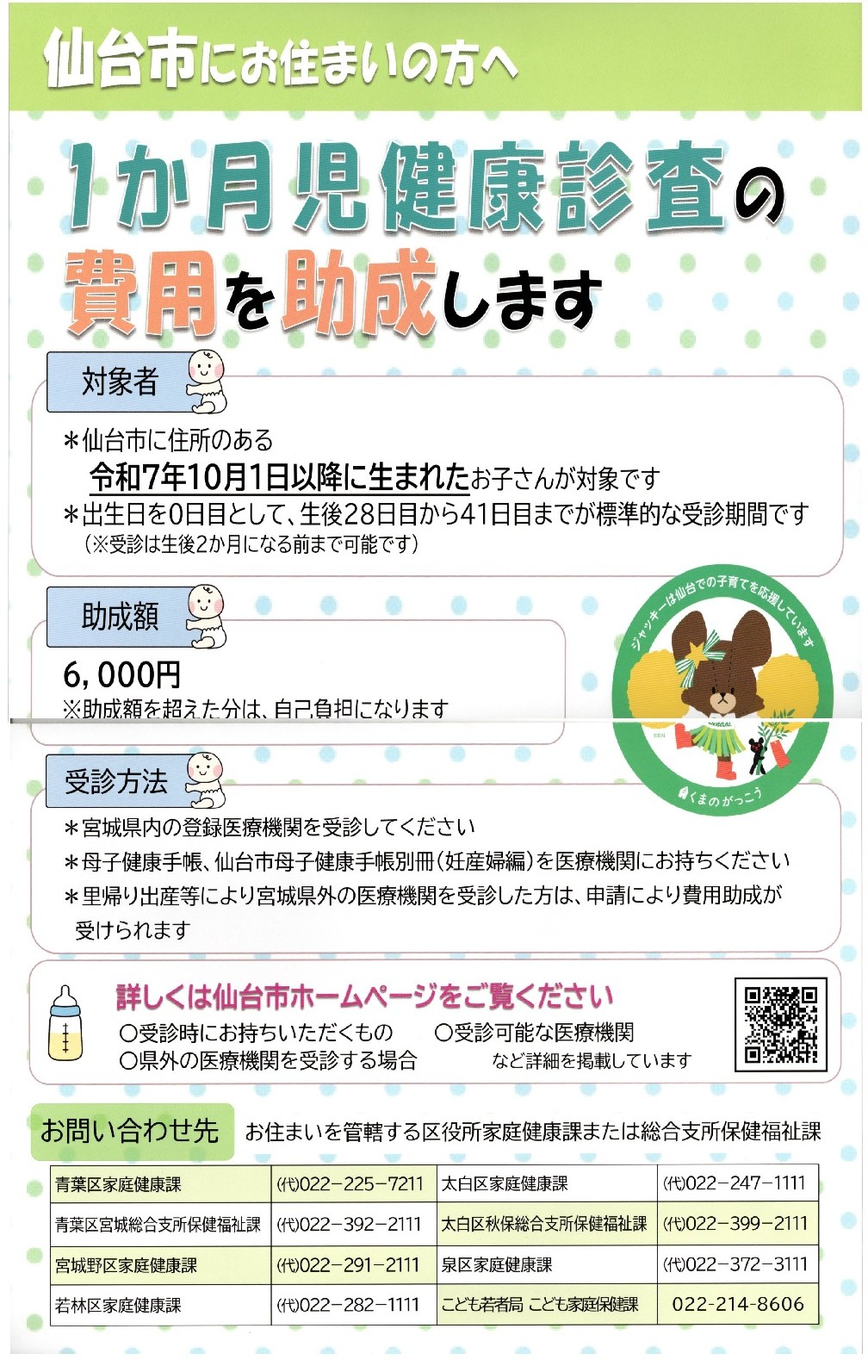 2か月健診時に股関節超音波検査で股関節脱臼の検査を行っております。費用は一般健診の範囲ですので、受診券があれば無料です。普通の健診では見つかりにくいケースも発見が可能となります。詳しくは専用ページでご確認くさだい。